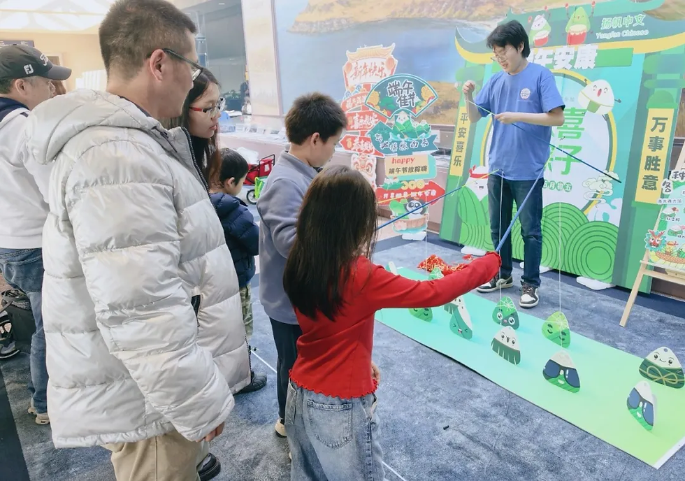 多所中文学校和青少年社团也带来了丰富多样的体验项目。亚省中文学校、华侨中文学校、扬帆中文、爱心学校青年俱乐部、蜂鸟之翼青少年联盟、NOWYOUTH等展位前人头攒动,书法、写甲骨文、剪纸、涂色游戏、脸谱制作,以及投壶、“钓粽子”“套月饼”等趣味活动吸引了众多学生参与;春节习俗转盘、节庆挂饰制作、端午龙舟和纸粽子等项目让传统文化在体验中更加可感可知。现场还穿插古筝、琵琶演奏,动静相宜。整个大厅欢声笑语不断,中文和中国文化在轻松愉快的氛围中悄然走进人心。